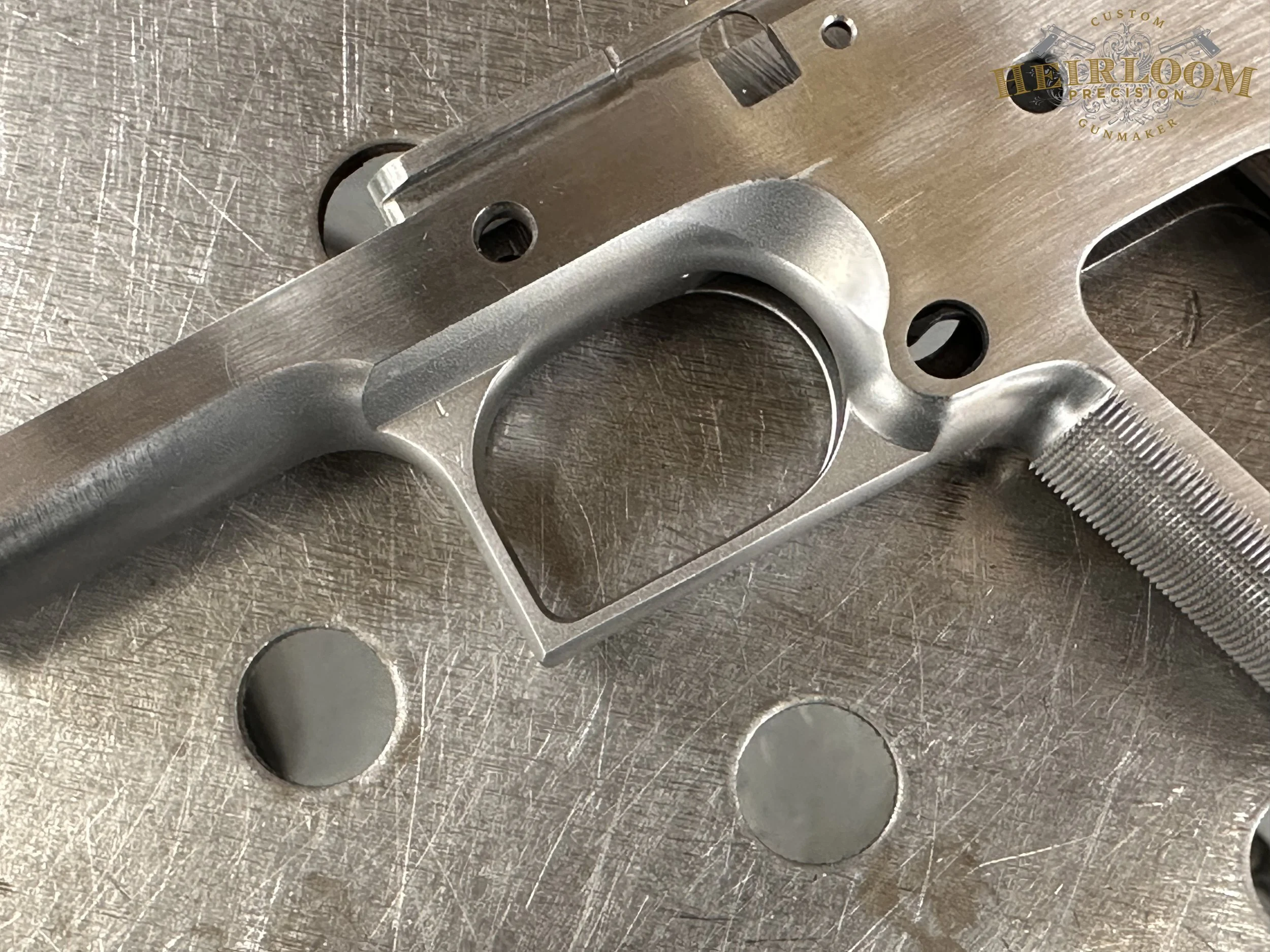 My checkering, done exclusively by hand, has been applied on many aspects of the 1911 and I have done it in lines per inch ranging from 20 to 75. However, this was to be the first squared and checkered trigger guard where both surfaces are done at 75lpi. Another aspect where this Renaissance Pistol provided a challenge that allowed me to push my limits and challenge my craft.